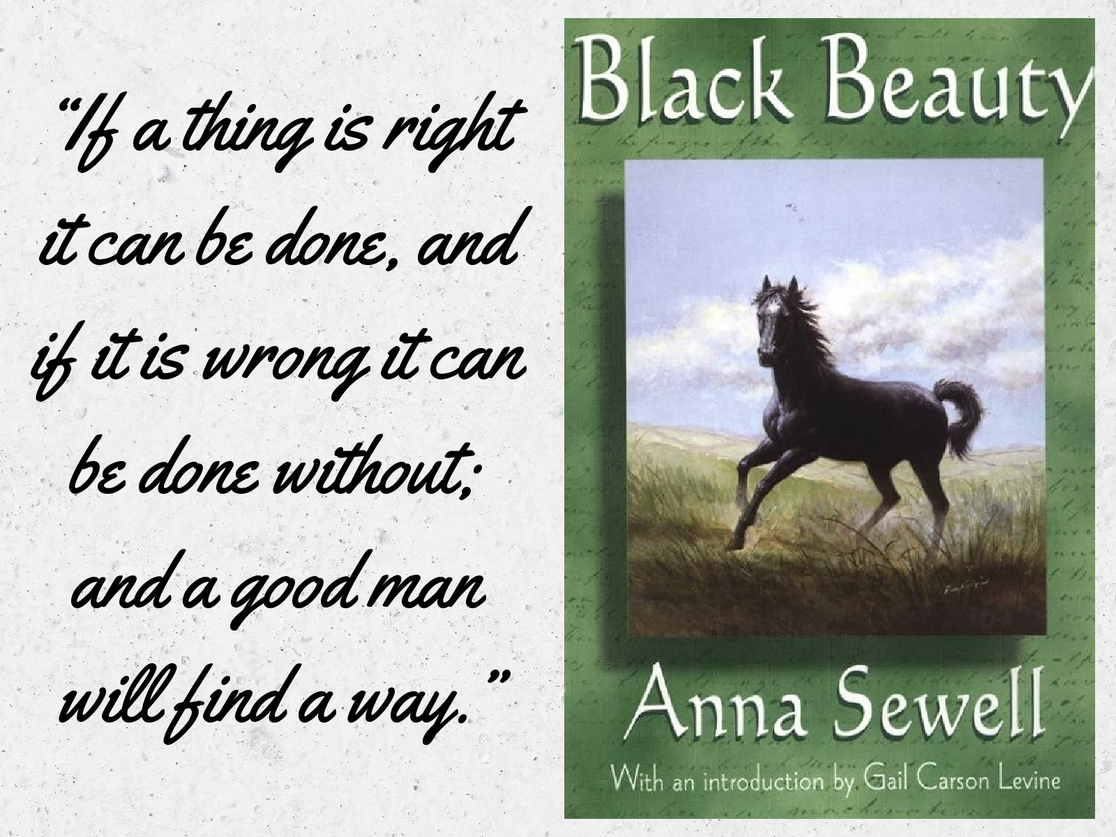 Black Beauty, by Anna Sewell— (Review written mostly by Charleston with some assistance from me.) Black Beauty is the story of a horse living in England in the late 1800s. He is a horse with many names who lives a life that is full of both good and bad. Black Beauty starts off on a lovely farm, and once he is old enough and has been taught how to behave by both his mother and his owner, he is sold off to a new owner: Squire Gordon. Over the years Black Beauty (whose name changes with each new home) is sold to many different owners and works many different jobs, and he gets treated differently each place he goes. The book is happy and sad with ups and downs of all kinds. The main purpose of the book is to view life from an animal’s perspective and learn to treat them well.