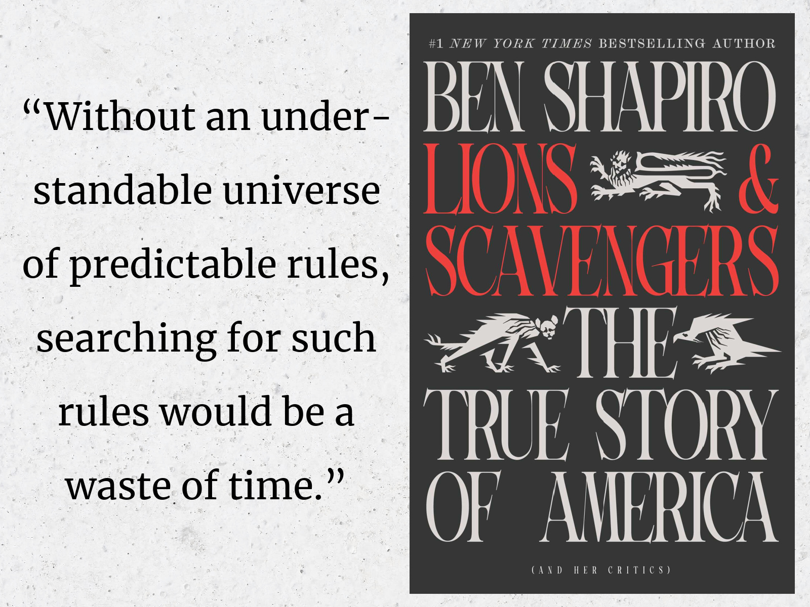 Lions & Scavengers: The True Story of America, by Ben Shapiro—In this insightful and thought-provoking examination of the current state of Western civilization, Ben Shapiro introduces the dichotomy of Lions and Scavengers. Lions, like the nation’s founding fathers, are driven by a spirit of success, responsibility, and duty. Lions believe that the universe was constructed by a set of discernible rules, and they embrace their own agency and moral duty. Lions come in many forms—the Hunter forges new paths and crafts new solutions; the Warrior is steadfast in defending his family and culture; the Weaver is dedicated to the construction and maintenance of the social fabric—and together these Lions form a pride who constructs a system of rules that protect individual rights and foster public virtue.