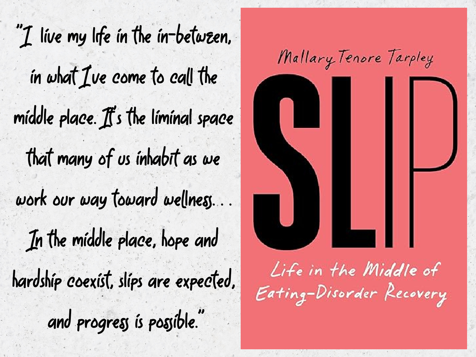 SLIP: Life in the Middle of Eating Disorder Recovery, by Mallary Tenore Tarpley—Mallary Tenore Tarpley was just eleven years old when she lost her mother to cancer. Desperate to remain close to her mom, Mallary thought that if she stayed the same size she’d been when her mother passed away, she could somehow stop time and keep her mom (or at least her mom’s memory) alive. Mallary stopped eating, and soon this seemingly insignificant decision morphed into full-blown anorexia. Mallary was admitted to Boston Children’s hospital, and though her desperate father hoped the stay would mark an end to Mallary’s eating disorder journey, it was but just the beginning.
