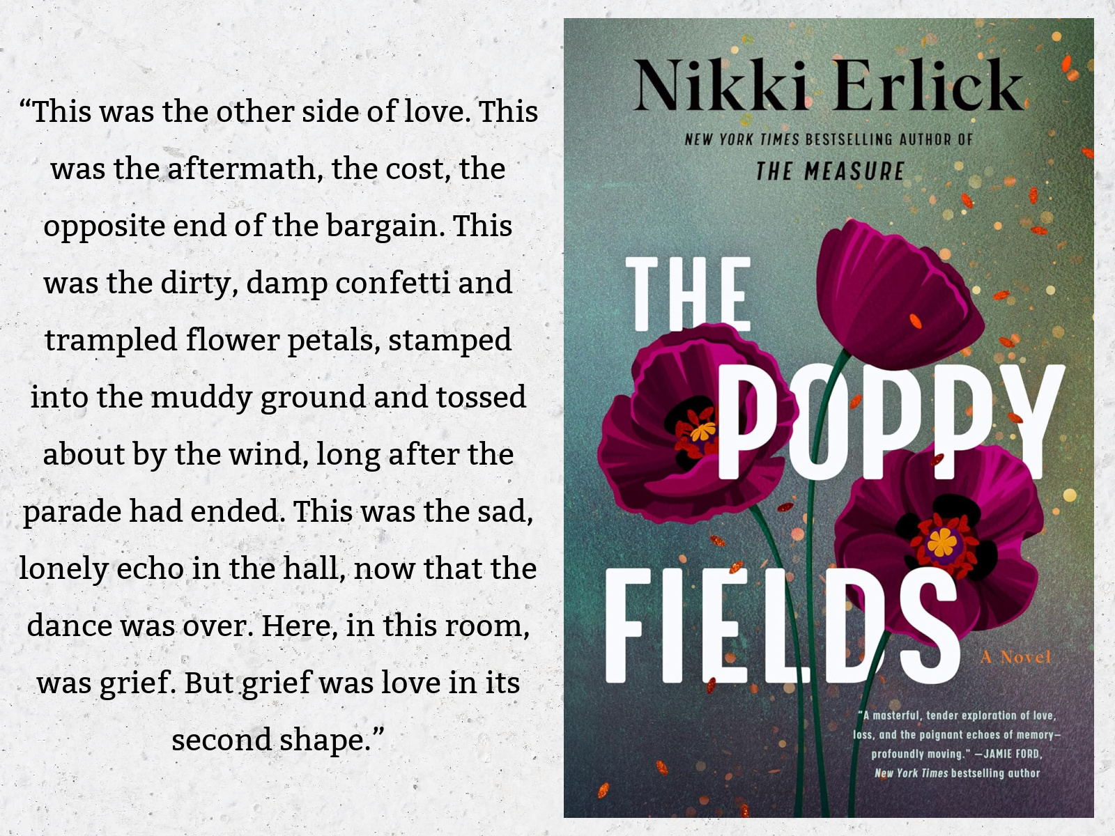 This book is a tough one to review. Like Erlich’s wildly popular debut (The Measure), the premise is fantastic. And as a meditation on grief, it’s absolutely stunning, offering a thoughtful and poignant exploration of grief in its many forms. Through our main characters and the interviews of The Poppy Fields’ applicants, we get to see many versions of why people grieve, how it affects them, and the ways that various individuals choose to grapple with their suffering. Erlich must have intense personal experience with her subject matter, or she’s done her research, because her insights into the connections between grief and love are tender and profoundly moving.