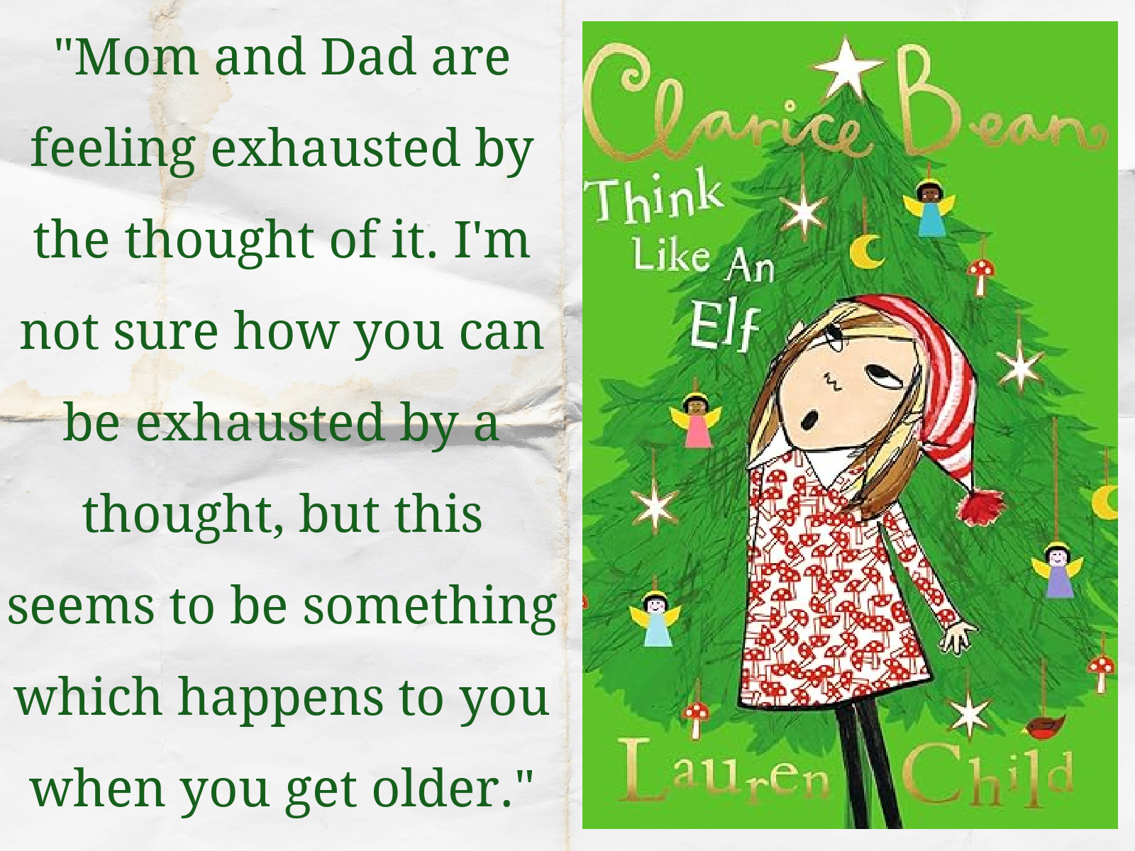 Clarice Bean: Think Like an Elf, by Lauren Child—Clarice Bean loves Christmas and she’s disappointed that this year’s festivities will be kept to a minimum because Mom and Dad are too exhausted to go all-out for the holiday. Clarice decides she will do her part to spread Christmas cheer wherever and however she can—whether it’s making fudge for her friends and family, helping out at home (even when the “helping” goes awry), and offering assistance to neighbors (including the unfriendly ones). Despite all of Clarice’s best efforts at making it an “exceptionordinarily” great Christmas, it seems that everything is going wrong! The Christmas tree is too big for the living room, Cement the Dog has eaten the Christmas turkey, and all the Christmas packages have gotten mixed up. But with her positive attitude and creative problem solving, Clarice might be able to rescue Christmas and put some Christmas spirit back into the rest of the Tuesday family.