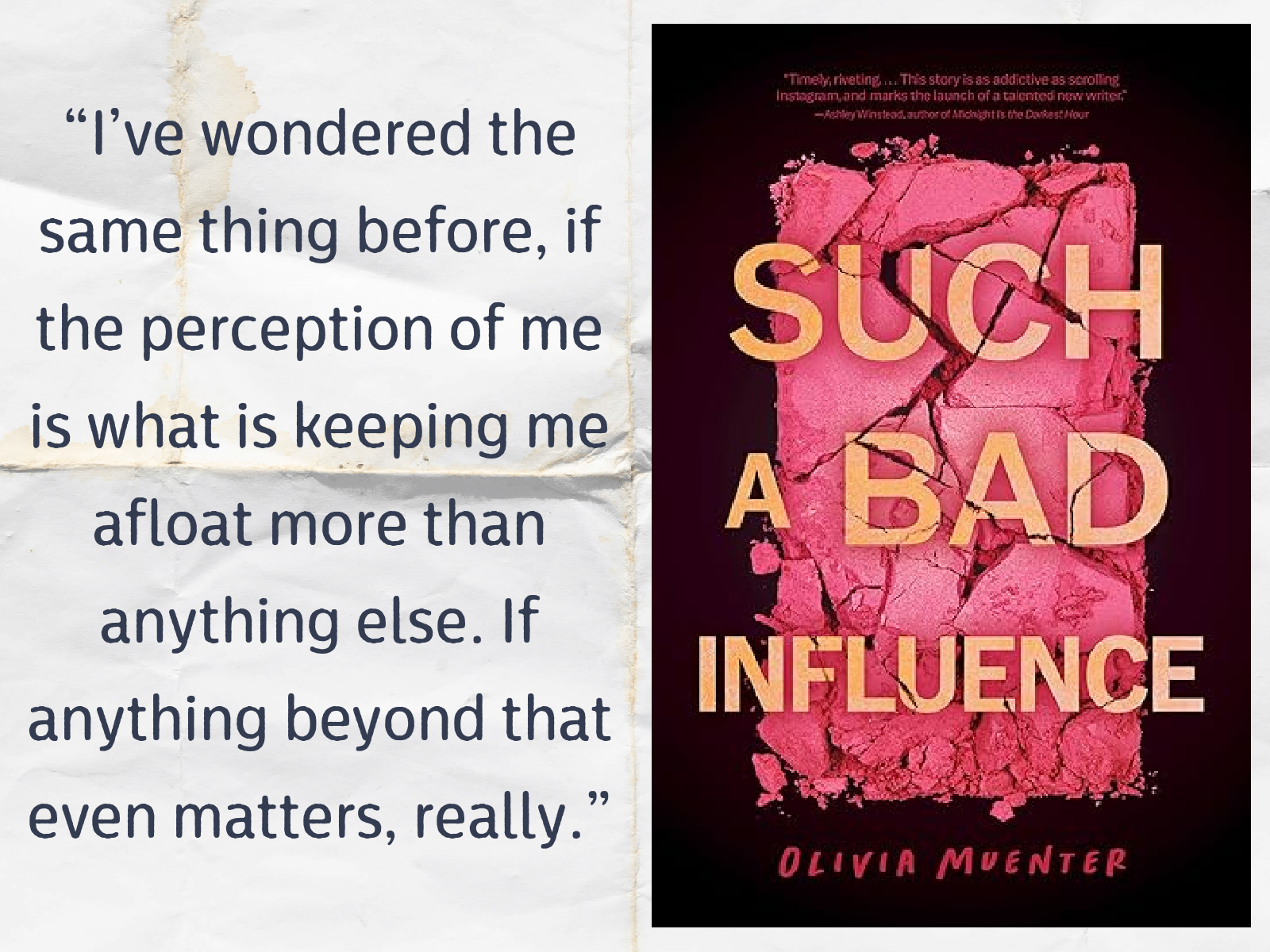 Such a Bad Influence, by Olivia Muenter—Hazel spent her childhood in the limelight as the daughter of an early YouTube adopter who was always creating content that she hoped would launch her into fame. That opportunity finally came when Hazel was in her teens and a family tragedy made Hazel’s younger sister, Evie, an instant star. Now Evie is 18 and an influencer with a multimillion-dollar career (all carefully managed by Evie’s image-obsessed, money-hungry mother). Hazel wants nothing to do with the family business, but when Evie goes missing without a trace, Hazel is forced to join forces with her estranged mother to determine the truth behind Evie’s disappearance. The investigation takes Hazel into the darkest corners of her family life, her sister’s questionable social circles, and the underbelly of influencer culture as Hazel learns more than she ever wanted to know about the sister she’s always loved but maybe never really knew.