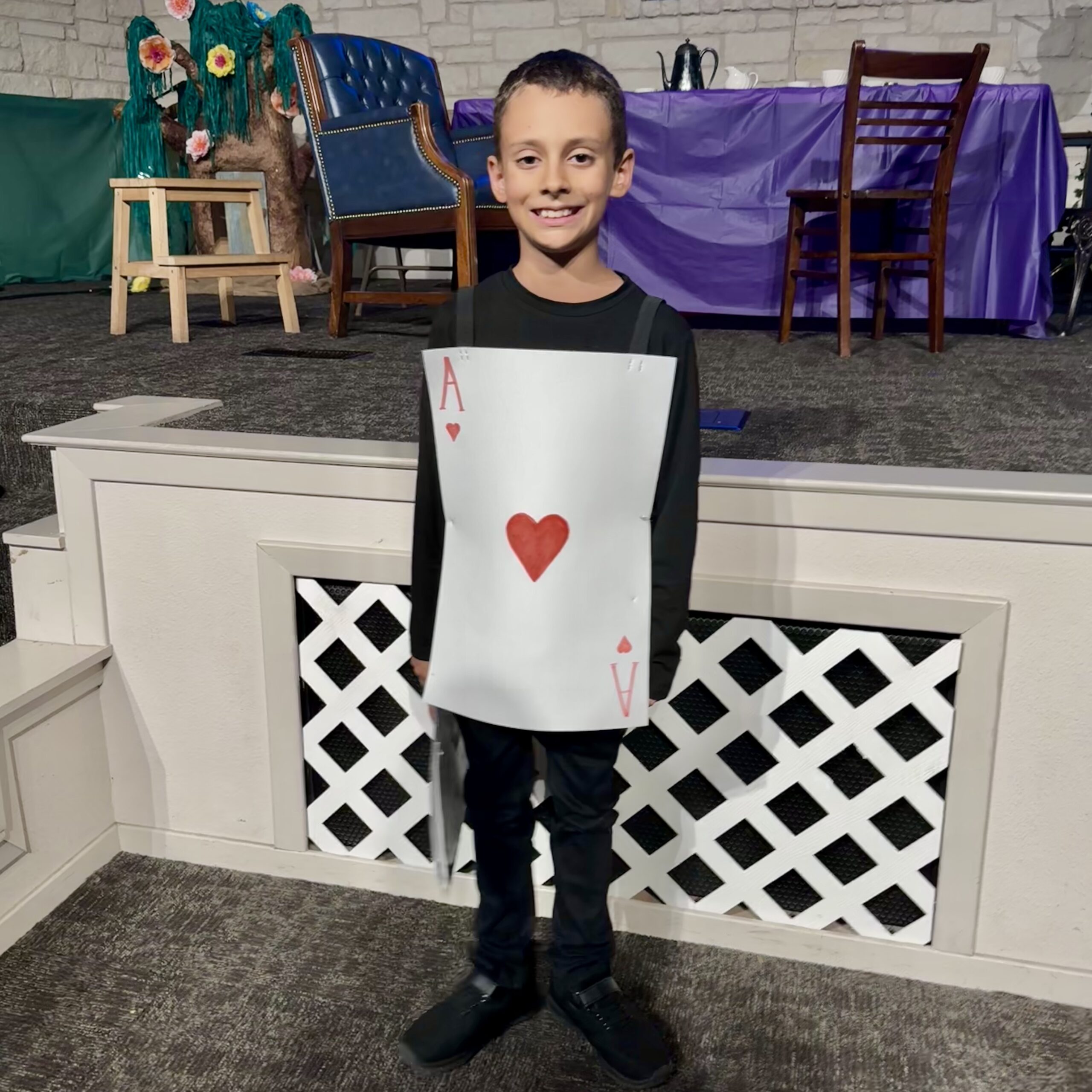 In the spring, Charleston got to serve on the production team for a play put on through his enrichment program. He got to design the cover of the play’s programs, and he even had a small role as the most stunning playing card you ever did see.