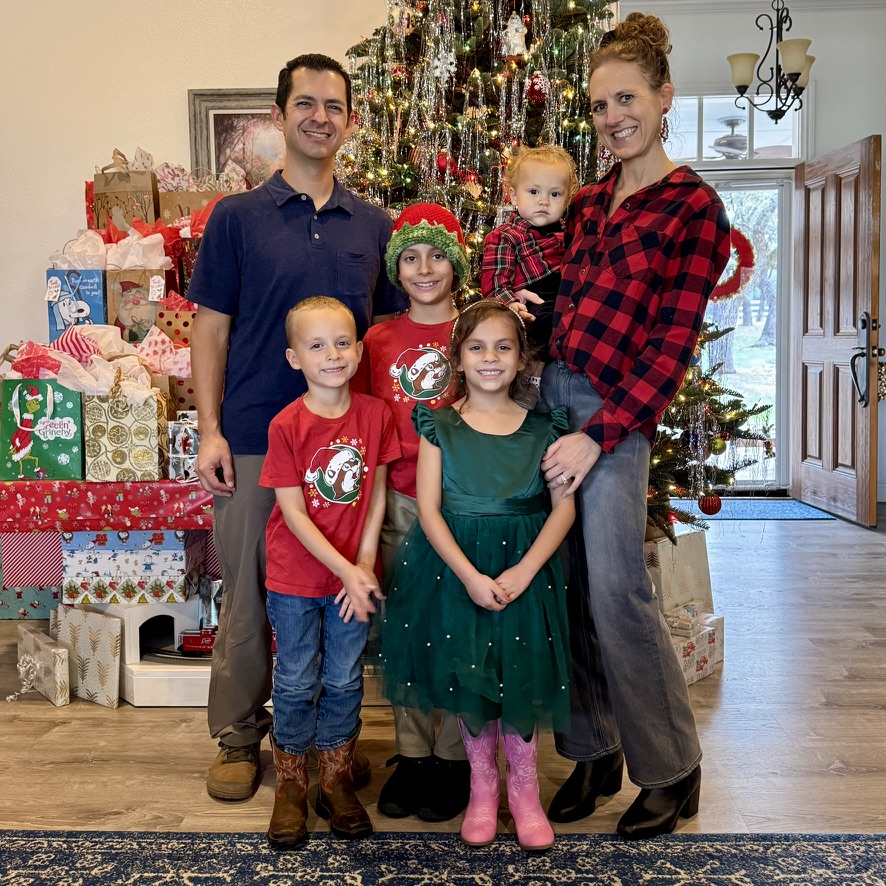 Christmas afternoon was spent at my in-laws’ where we had a lovely time, despite Nico being sick and fussy. The kids put on the sweetest little Christmas pageant directed by my father-in-law, and we all had fun opening SO MANY gifts. Charleston’s thrill at receiving a Nintendo Switch 2 from his grandparents was off the charts, and the twins were adorable on their new ATVs. I loved seeing Kali and cousin Brooke in their matching green dresses (courtesy of my sister-in-law), which Kali accessorized with her darling new pink boots (courtesy of my other sister-in-law)!