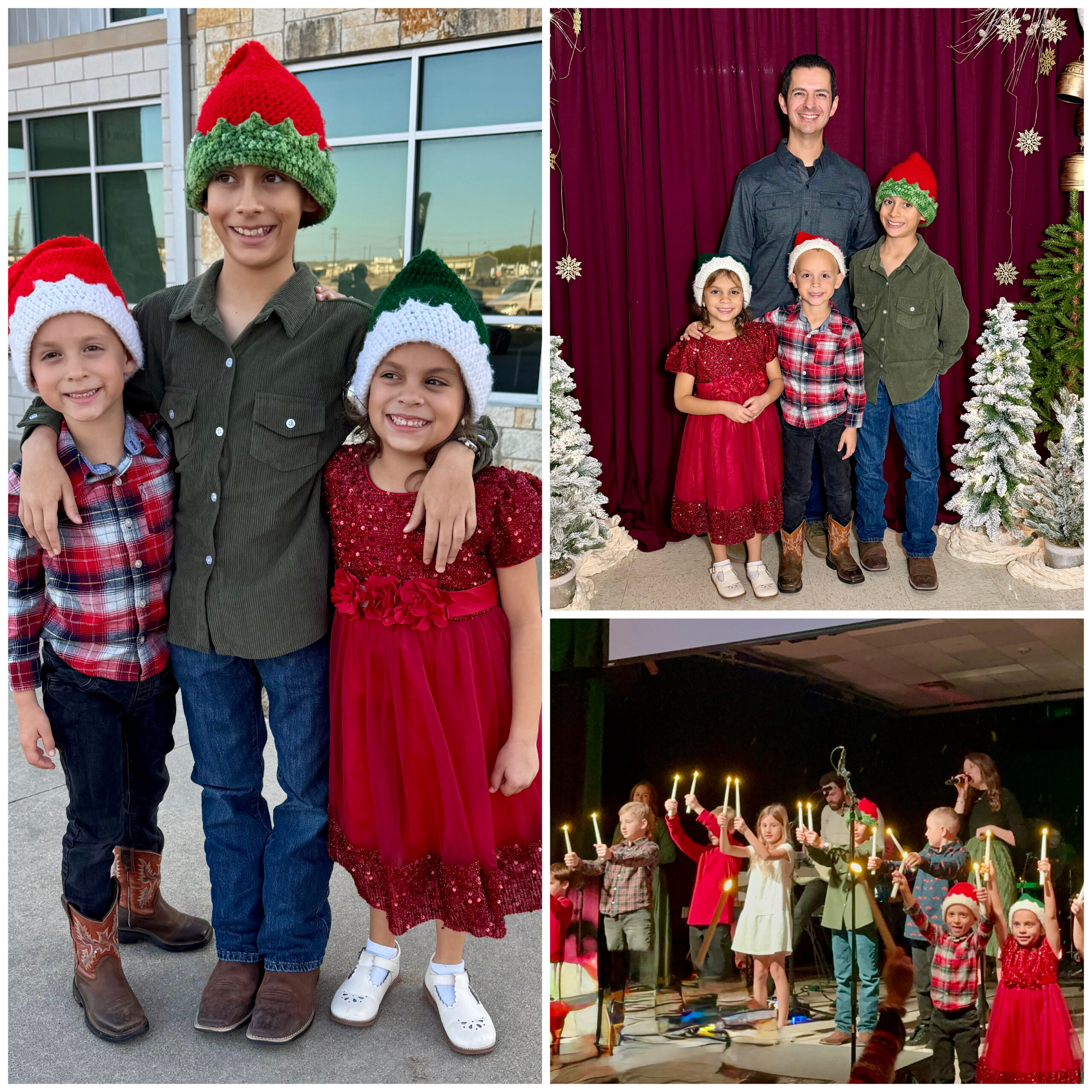 Luke and Charleston had to leave early on the afternoon of Christmas Eve to work production for our church’s Christmas Eve services. The littles and I joined them later for a service. It was so special to see the three older kids perform onstage for the kids’ choir; they did a great job! Unfortunately, Nico started projectile vomiting just before the service started, so as soon as we’d see the kids’ performance, Nico and I headed home. I was SO BUMMED to miss out on the whole service that is always my favorite of the year; Luke was sweet and got videos of the congregation singing Silent Night by candlelight, and he was sure to get a photo booth pic with the kids.