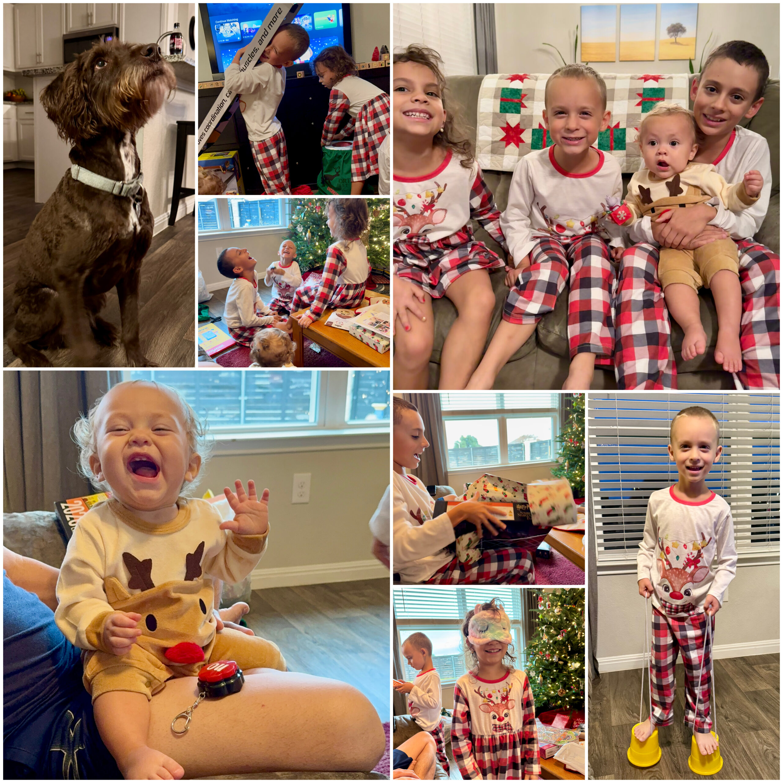 Christmas morning was a success! The kids were all thrilled with their gifts and I loved seeing them so happy. Highlights were the Yes/No button keychains that Sully had asked for and that they all found hilarious (including Nico who liked pressing “no” with the Rudolph nose on his jammies); the kids taking turns walking around the house on the stilts Sully got from Santa; Kali wearing her unicorn eye mask while perusing her ballet sticker books; and Charleston’s excitement about his Lego Sorting Hat. I also loved the custom cards I received from Luke and each of the kids.