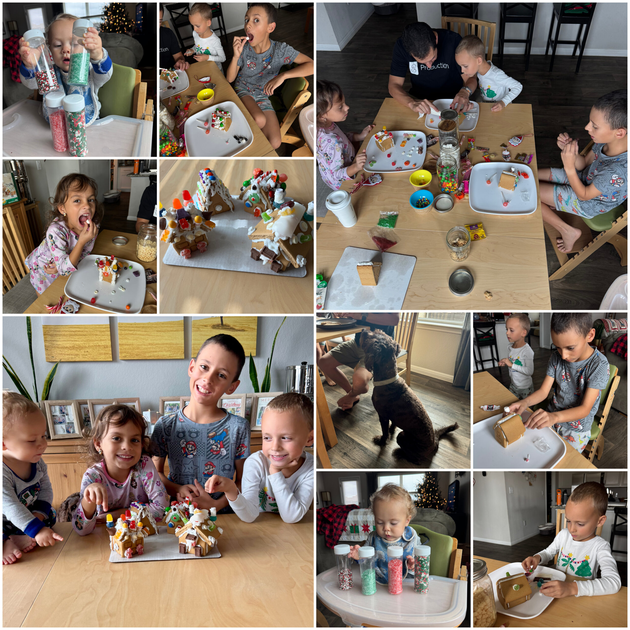 On Christmas Eve, we made our gingerbread houses! We got a kit this year with four mini houses, and we agreed that next year we will go back to decorating one bigger house as a family, but it was still a fun tradition. Nico enjoyed stacking sprinkles (and snacking on the occasional marshmallow) while we built.