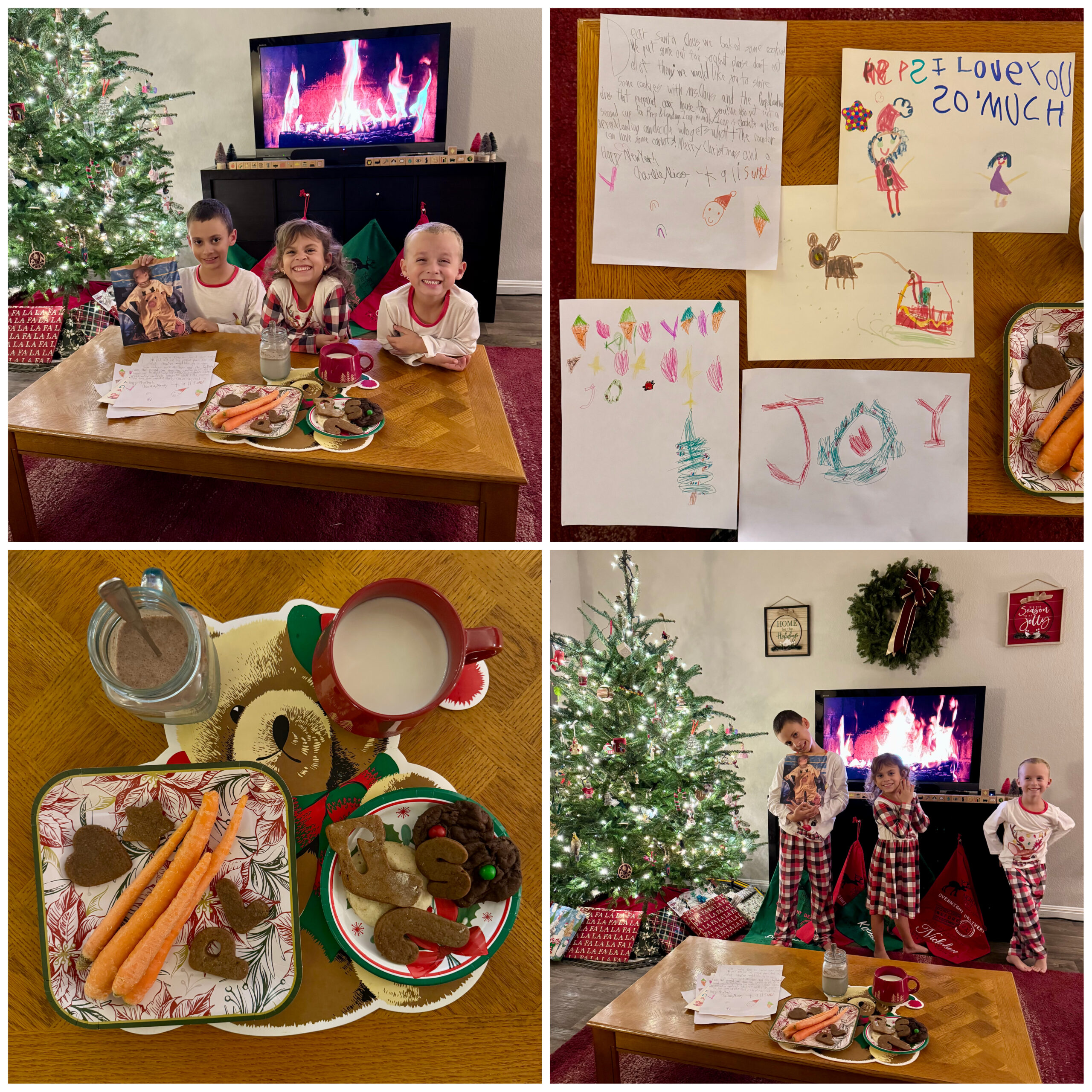 That evening we came home from church, did our final evening of Advent traditions, and got ready for Santa. Santa prep was a little stressful this year as we were managing a very-sick Nico while also trying to get ready, but the kids got their notes for Santa written and we set out cookies and milk for Santa, cookies and chocolate milk for Prep and Landing (IYKYK), and carrots for the reindeer.