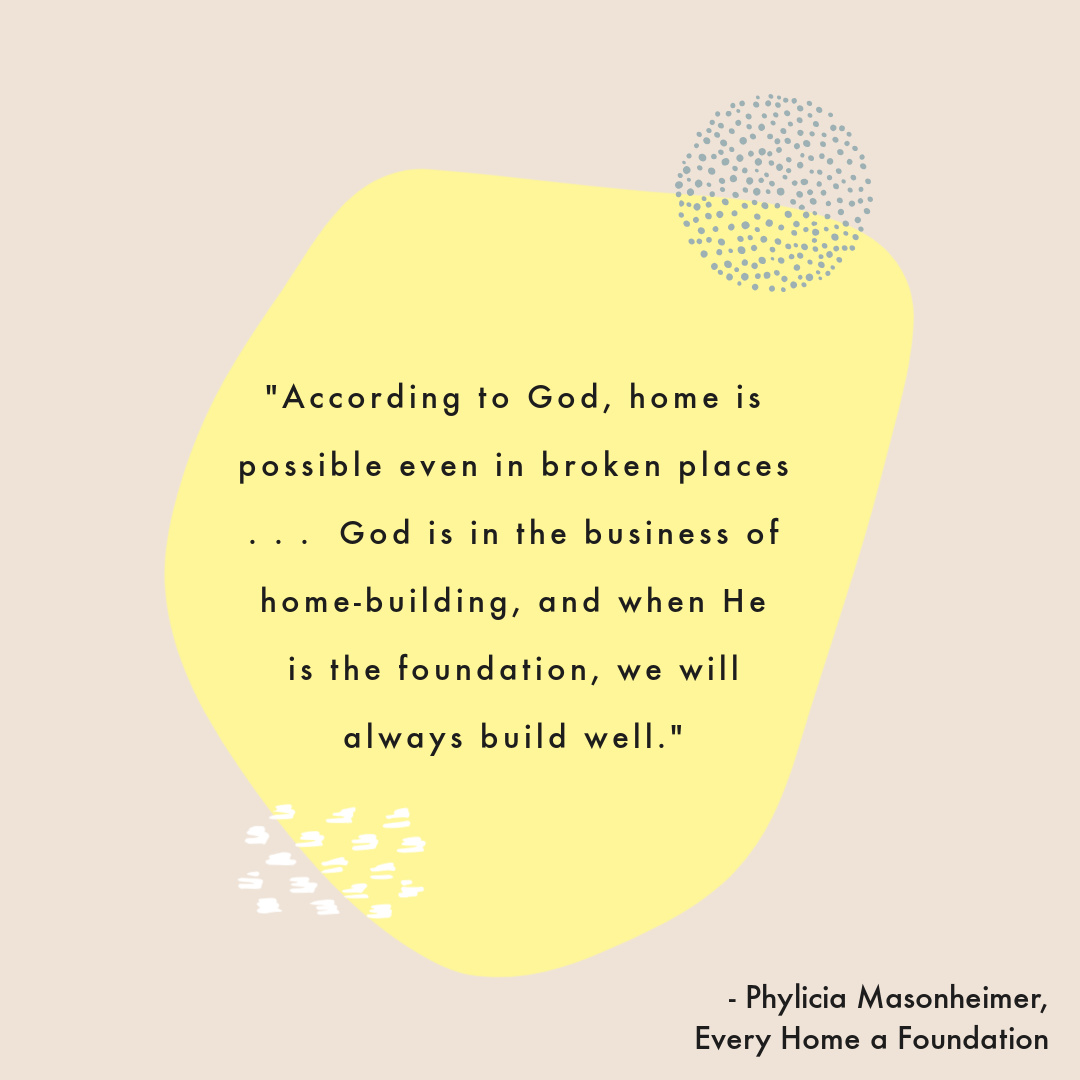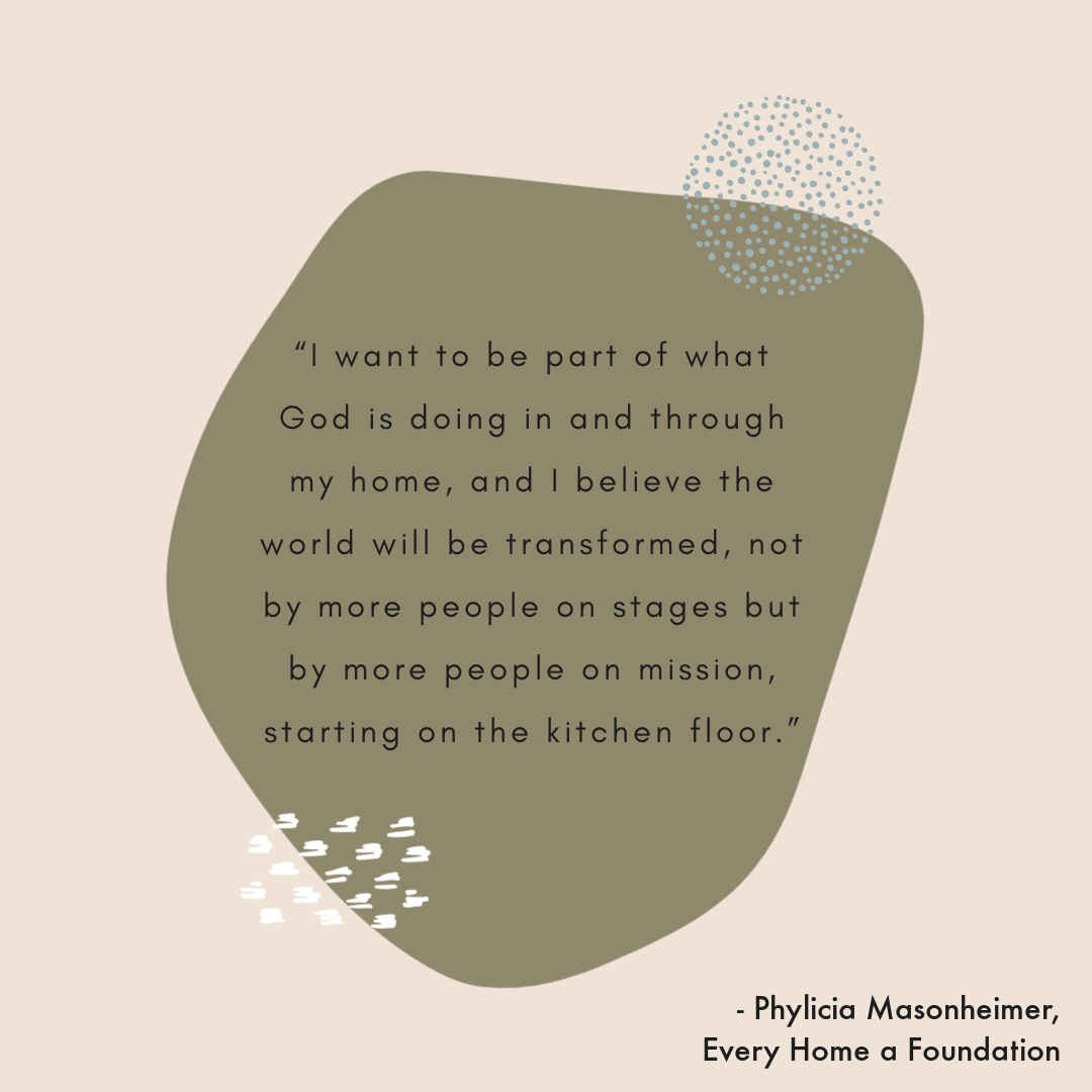 Whenever I’m asked my profession on a form, I list my job title as “Homemaker.” Every Home a Foundation has provided me with useful tools and important frameworks for embracing this title in a way that welcomes the Lord into every aspect of my daily work. And while the book is ESPECIALLY helpful for those of us who spend the vast majority of our time in our houses, it is a relevant guide for anyone who lives in a home and wants to experience more of God’s presence within its walls.