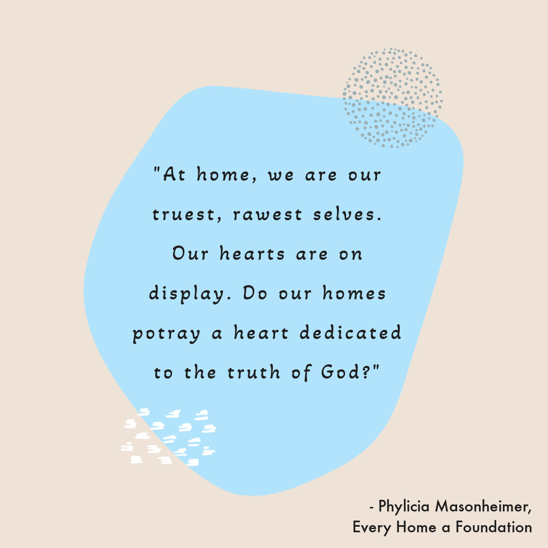 Throughout Every Home a Foundation—and especially in the final chapter on hospitality—Phylicia places a strong emphasis on our homes being places of ministry for people beyond the members of our family. It is this emphasis that will stick with me the most. As an Introvert who prioritizes family time over all other social interactions, I was reminded that my home is not just for those who share my last name. God has gifted me this home in order to bless others, and having young children and an aversion to busyness is not an excuse for avoiding hosting opportunities. My home can be the foundation for the faith of our own family unit, but it shouldn’t stop there. It doesn’t matter if my home is small or not entirely tidy, or if the food I prepare isn’t gourmet, because hosting others in my home is not about showing off my homemaking skills: “hospitality is never about is. It’s about loving others the way God does.”