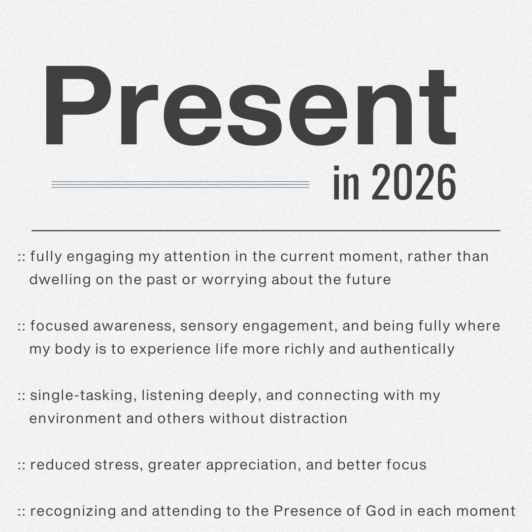 This is my twelfth time choosing One Word to define my year. (Past words have been Shepherd in 2025, Light in 2024, Faithful in 2023, Wholehearted in 2022, Wonder in 2021, Joy in 2020, Abide in 2019 [that was my favorite!], Grace in 2018, Love in 2017, Integrity in 2016, and Open in 2015.) And I know from experience that in order to get the most out of this practice, I need to be both proactive and specific. Beyond just choosing to be more present in 2026, I intend to embrace a few practical strategies. I plan to read at least one book on the subject of Presence each season of the year. I will also engage in seasonal Presence challenges, such as fasting from my phone, engaging in sensory-mindfulness activities, writing gratitude lists, or practicing prayerful meditation. You will undoubtedly be hearing more about these books and these challenges in blog posts throughout the year, so stay tuned!